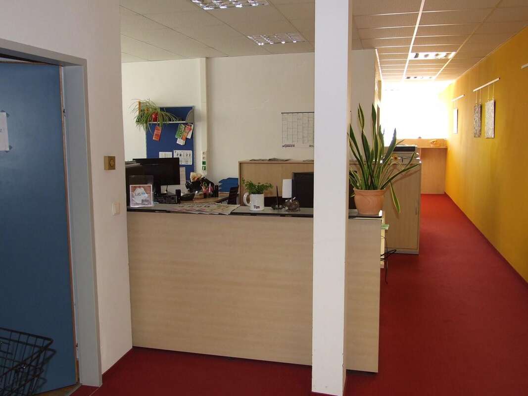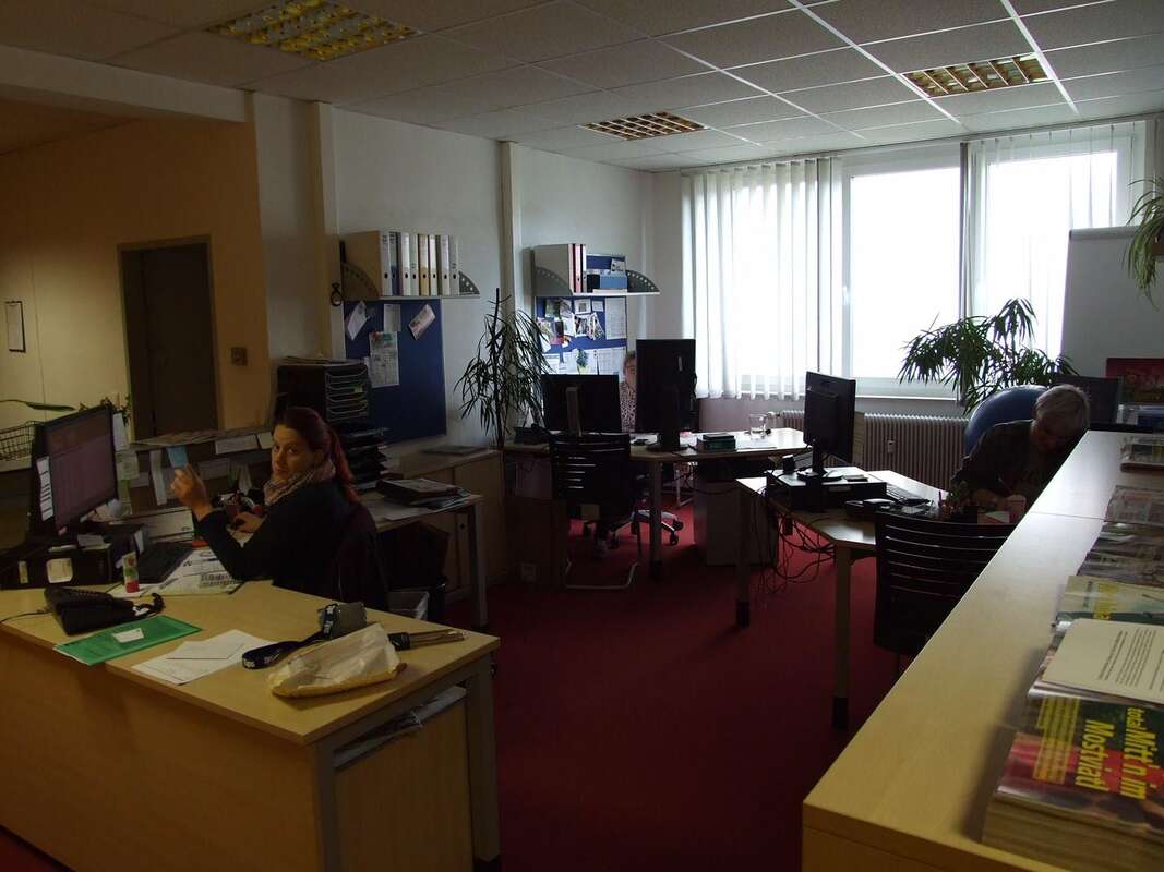 Wir 11 Mitarbeiter sind auf zwei Stockwerke und 6 Büros aufgeteilt, in jedem Stockwerk befindet sich eine Küche.