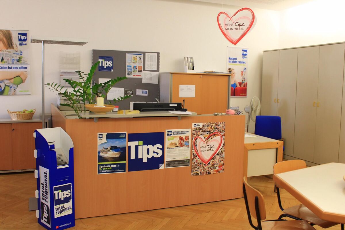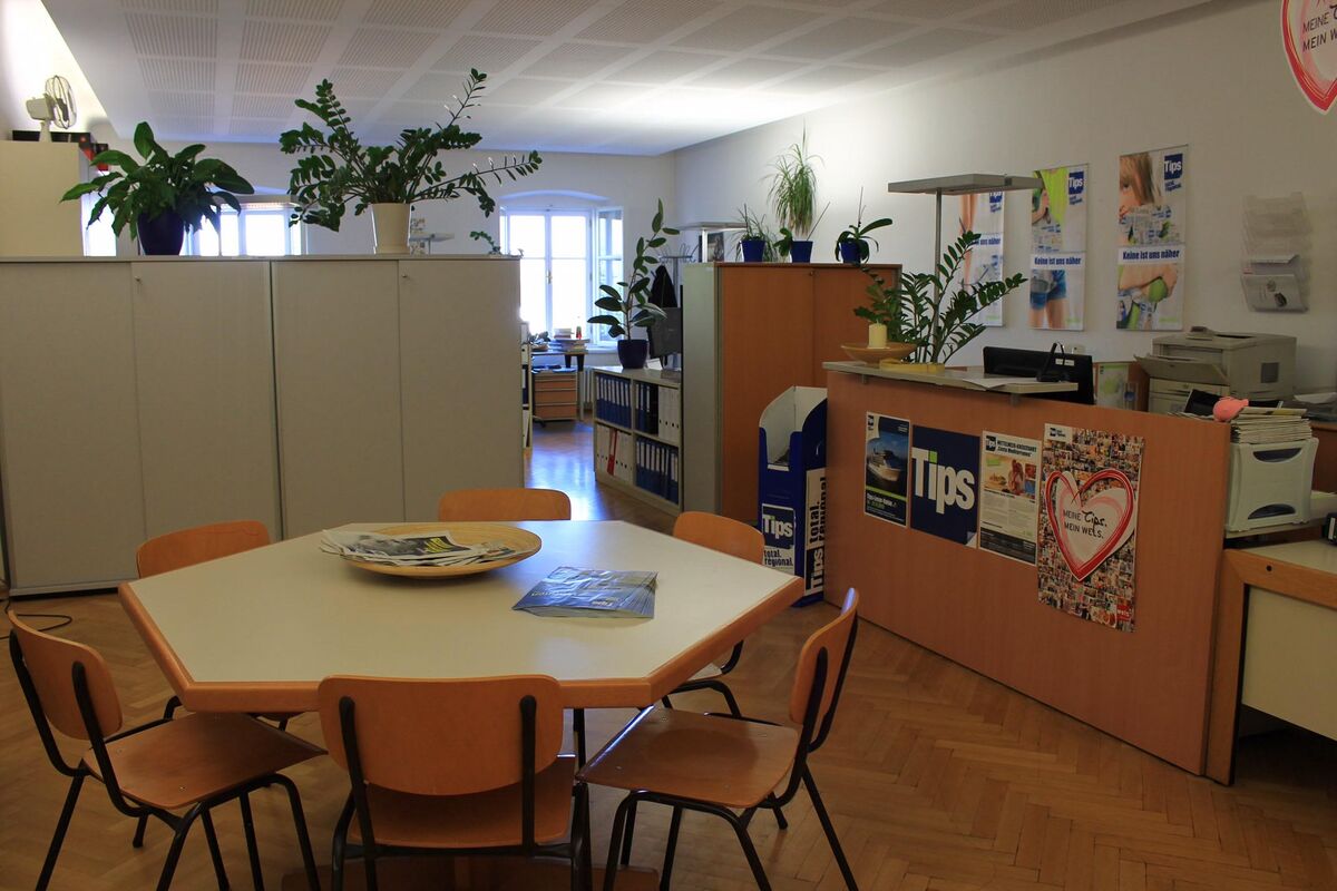 Die Tips Geschäftsstelle befindet sich im Wimmer Medienhaus im 3. Stock, besteht aus 2 Großraumbüros mit jeweils 5 Arbeitsplätzen (Redaktion, Grafik und Sekretariat) bzw. 3 Arbeitsplätzen (Verkauf und Verkaufsinnendienst) und einer kleinen Küche.