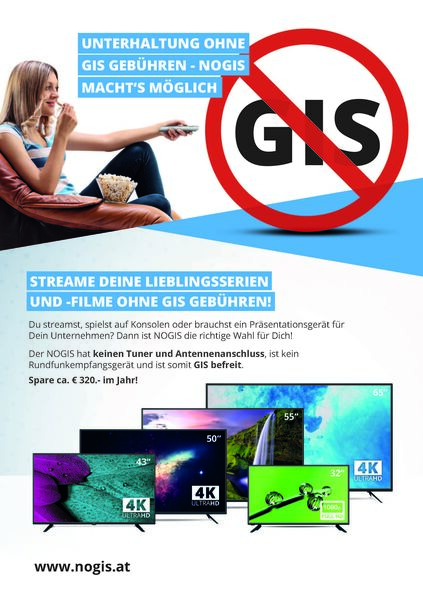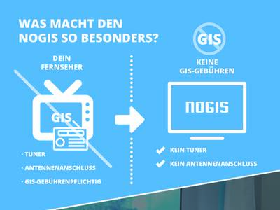 Geräte von NOGIS haben keinen integrierten Tuner oder Antennenanschluss und sind deshalb nicht GIS pflichtig. Mit einem TV Stick, wie z.B. dem Amazon Fire Stick, beziehst du dein Programm über alle gängigen Streaming Dienste oder TV Apps.